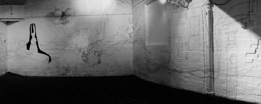 Melanie Cove has whitewashed the walls of the Lescar Project Space to provide a canvas for a series of drawings of human figures, ranging from explicit male and female genitalia to tender depictions of the idealised nature of childhood.